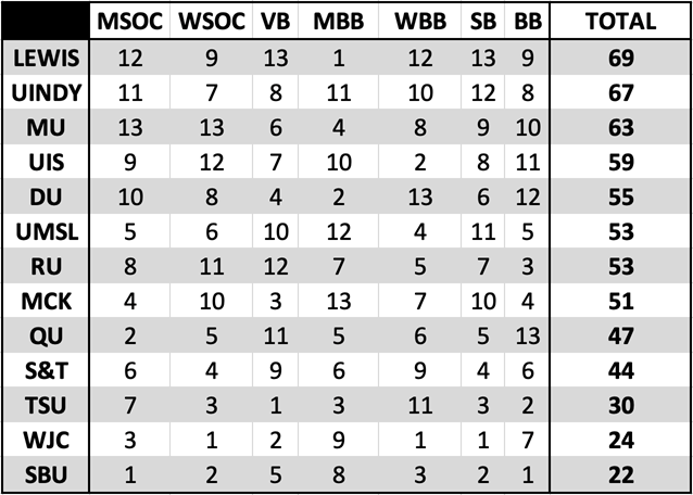 2022-23 GLVC Commissioner's Cup Standings DU - Drury | UINDY - Indianapolis | UIS - Illinois Springfield | LEWIS - Lewis | MU - Maryville | MCK - McKendree | S&T - Missouri S&T | UMSL - Missouri-St. Louis | QU - Quincy | RU - Rockhurst | SBU - Southwest Baptist | TSU - Truman State | WJC - William Jewell PREVIOUS WINNERS 2022-23 - Lewis 2021-22 - Drury 2020-21 - Southern Indiana 2019-20 - N/A (The 2019-20 GLVC Commissioner's Cup Trophy was not awarded this year after the COVID-19/Coronavirus pandemic forced the cancellation of all spring sports) 2018-19 - Bellarmine 2017-18 - Southern Indiana 2016-17 - Rockhurst 2015-16 - Indianapolis 2014-15 - Drury 2013-14 - Indianapolis 2012-13 - Lewis 2011-12 - Northern Kentucky 2010-11 - Northern Kentucky 2009-10 - Northern Kentucky 2008-09 - Northern Kentucky 2007-08 - Northern Kentucky 2006-07 - SIU Edwardsville 2005-06 - Northern Kentucky 2004-05 - Northern Kentucky 2003-04 - Southern Indiana 2002-03 - Northern Kentucky